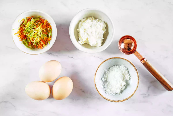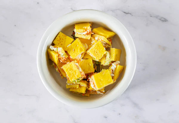- Flip over like a pancake and spread the cottage cheese and veggies over half of the cooked surface. Fold like an omelet. Cool and cut to bite-sized pieces to serve.