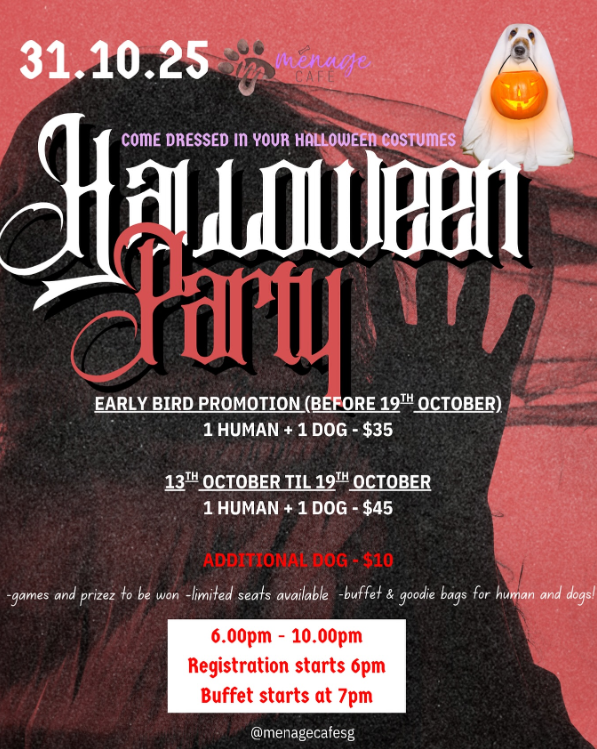 It’s time to end October with a bang at Menage Café’s Halloween Pawty! This paw-some indoor event promises a night full of fun, food, and furry festivities. Bring your furkid in their best costume and get ready for a buffet feast, games, and prizes under the spooky lights!