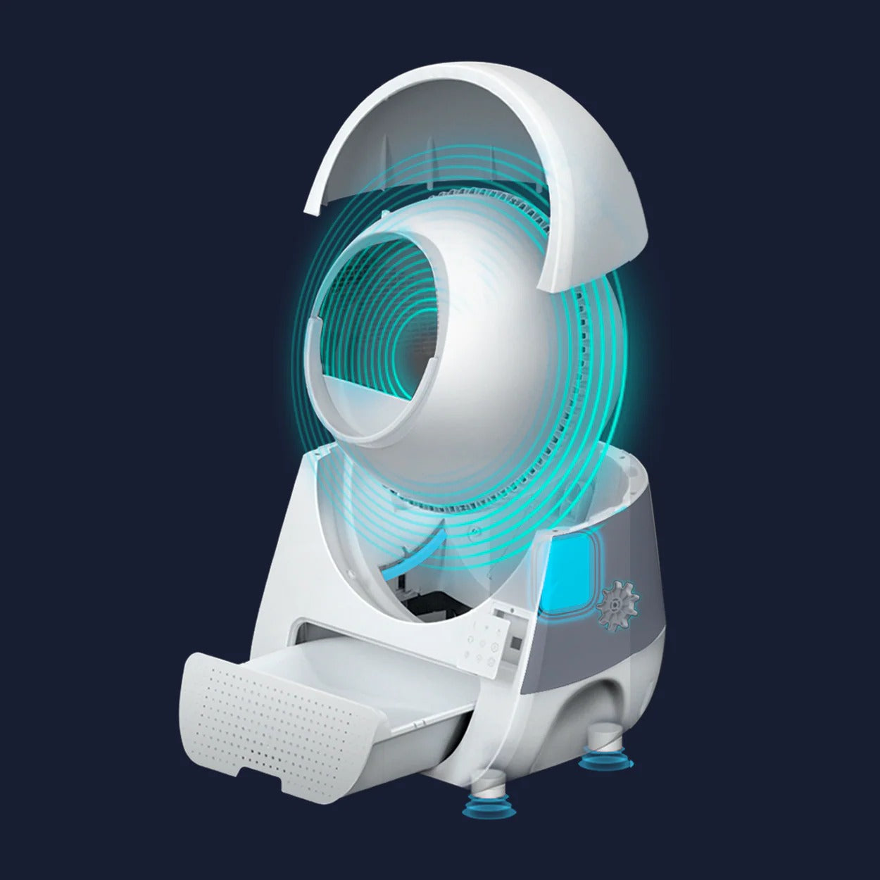 The Catlink Scooper Pro Ultra uses four layers of odor control: active oxygen deodorization, UVA + UVC sterilization, high-density activated carbon, smart Odor Eliminator.