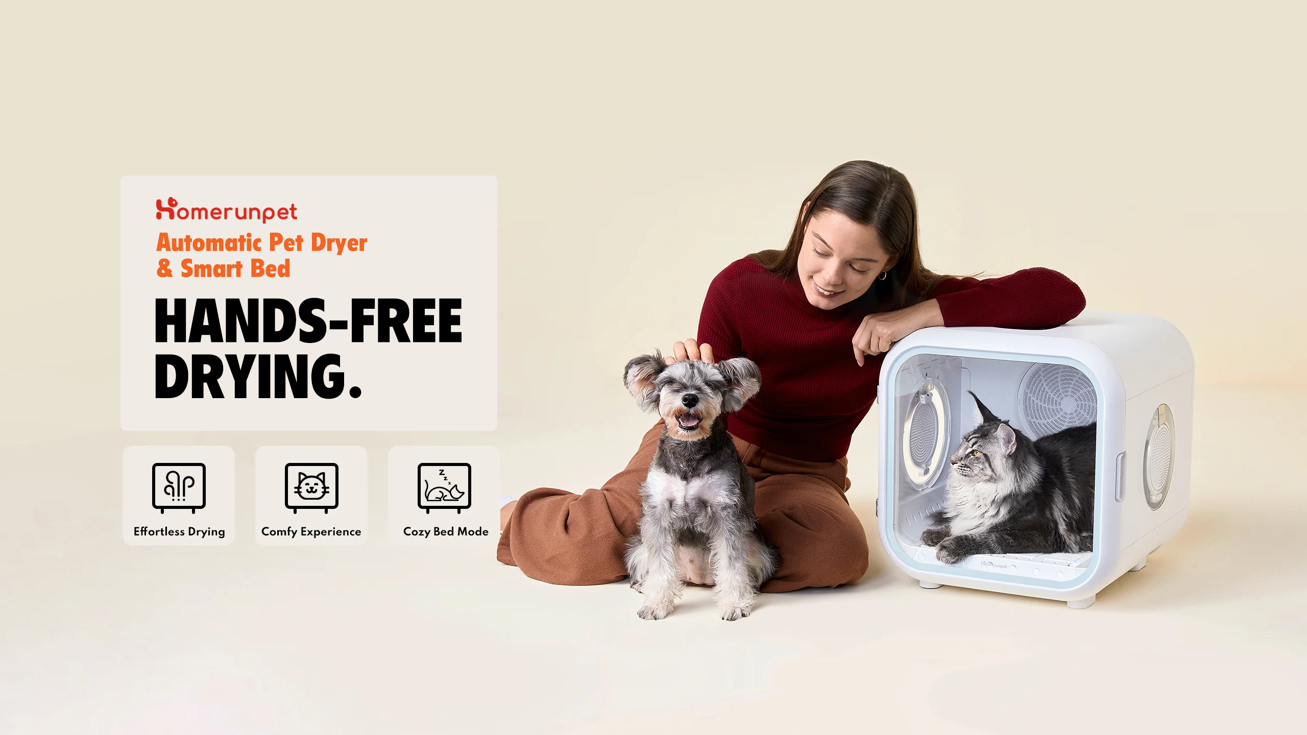 Our Homerun Pet Dryer isn't just for drying; it's also a comfy bed! With both cooling and heating modes, your pet can snuggle up in the perfect temperature, rain or shine.