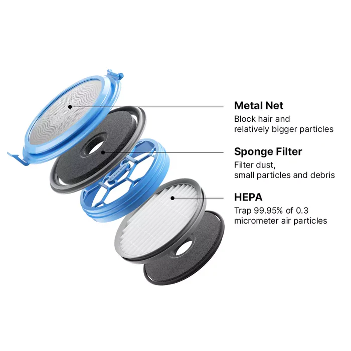 The vacuum is meticulously designed with a trio of filtration components: a HEPA filter, a metal net, and a sponge filter. This powerful combination ensures optimal performance, capturing an impressive 99.95% of fine dust, hair, and other particulates. Whether you're dealing with pet hair, everyday dust, or other household debris, this vacuum is equipped to handle it all, providing a cleaner and healthier environment for you and your family.