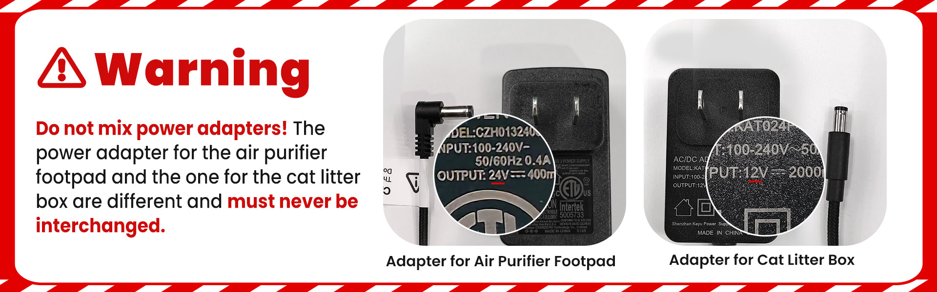 The AirStep and litter box use different power adapters and must not be interchanged.