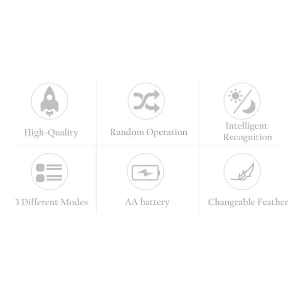 Normal Mode (Yellow indicator): The feather randomly pops out of 6 holes and runs for 8 minutes before shutting off.