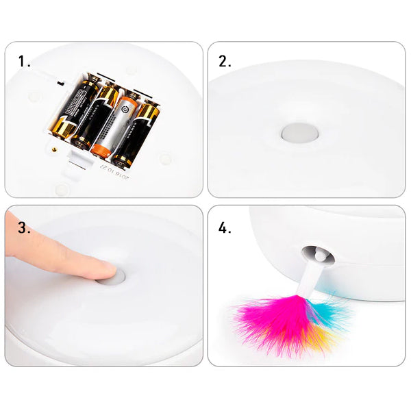 - Switch the feather mode: Long press to 'change feather mode'. Short press button to shut down the smart cat toy. Then, simply rotate counter-clockwise to unscrew the feather when it's time to replace and install a new feather by screwing on it the same way.