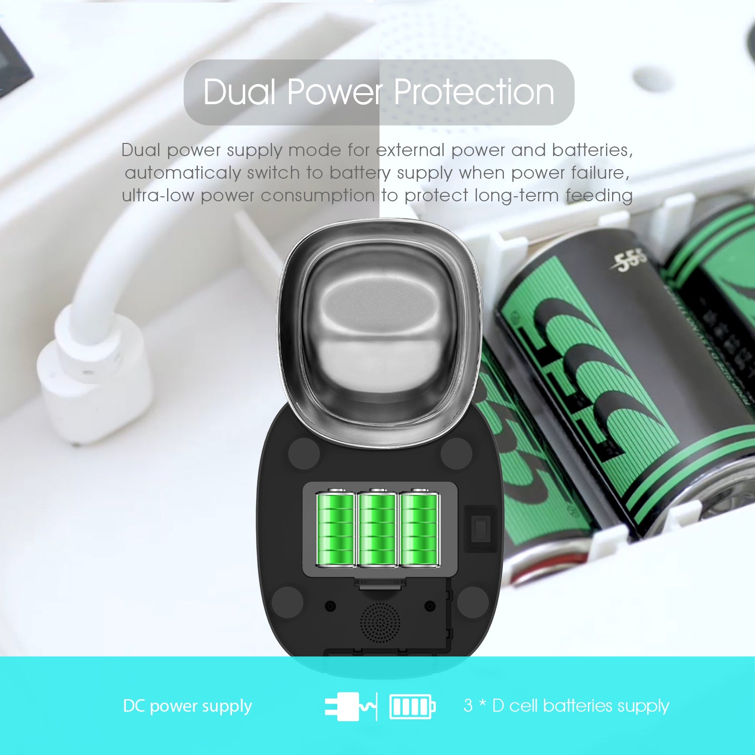 Power outage? No problem. Our dual power supply ensures that your pet's feeding schedule remains uninterrupted. For full functionality, we recommend using AC power.