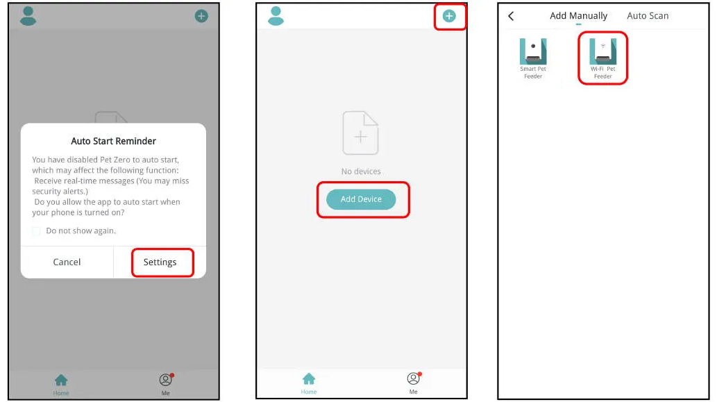 3. When you login, the App will ask you to access certain permissions. These permissions are very important for the App so please allow them. Click Add Device or + to add a new pet feeder. Choose the Add Manually tab and select Smart Pet Feeder.
