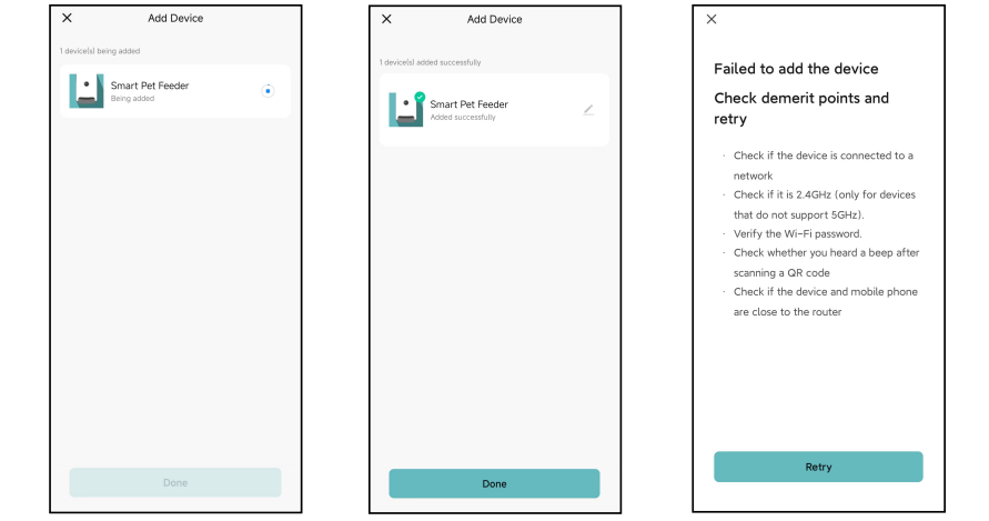 6. The feeder will then try to connect to the Wi-Fi network. When connected, click Done to complete the adding process.
