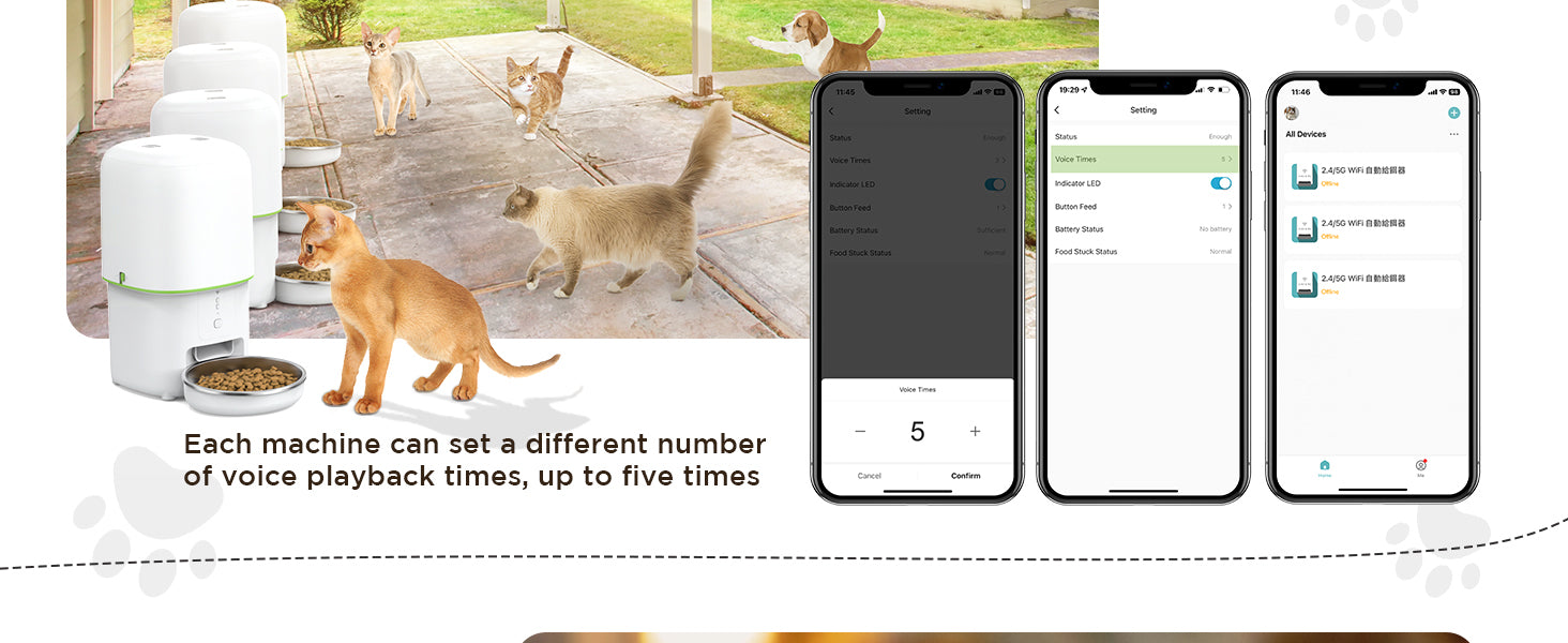 Conveniently manage feeding times up to 15 meals per day and receive real-time alerts on food levels, blockages, and low battery via the app. - Intelligent Sensor System